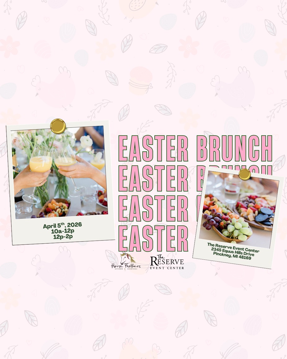 Enjoy a full Easter brunch buffet prepared by the culinary team at Horse Feathers Kitchen & Cocktails, served in our banquet space at The Reserve Event Center.